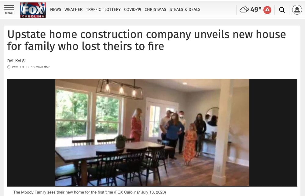 Alair Homes Clemson partnered with others in the construction community to build a new house for an Upstate family who lost theirs in a fire. The Moodys had been planning an addition to their home so they could begin fostering children, but then the fire happened. On Monday, the Moodys got their first look at their brand new house.